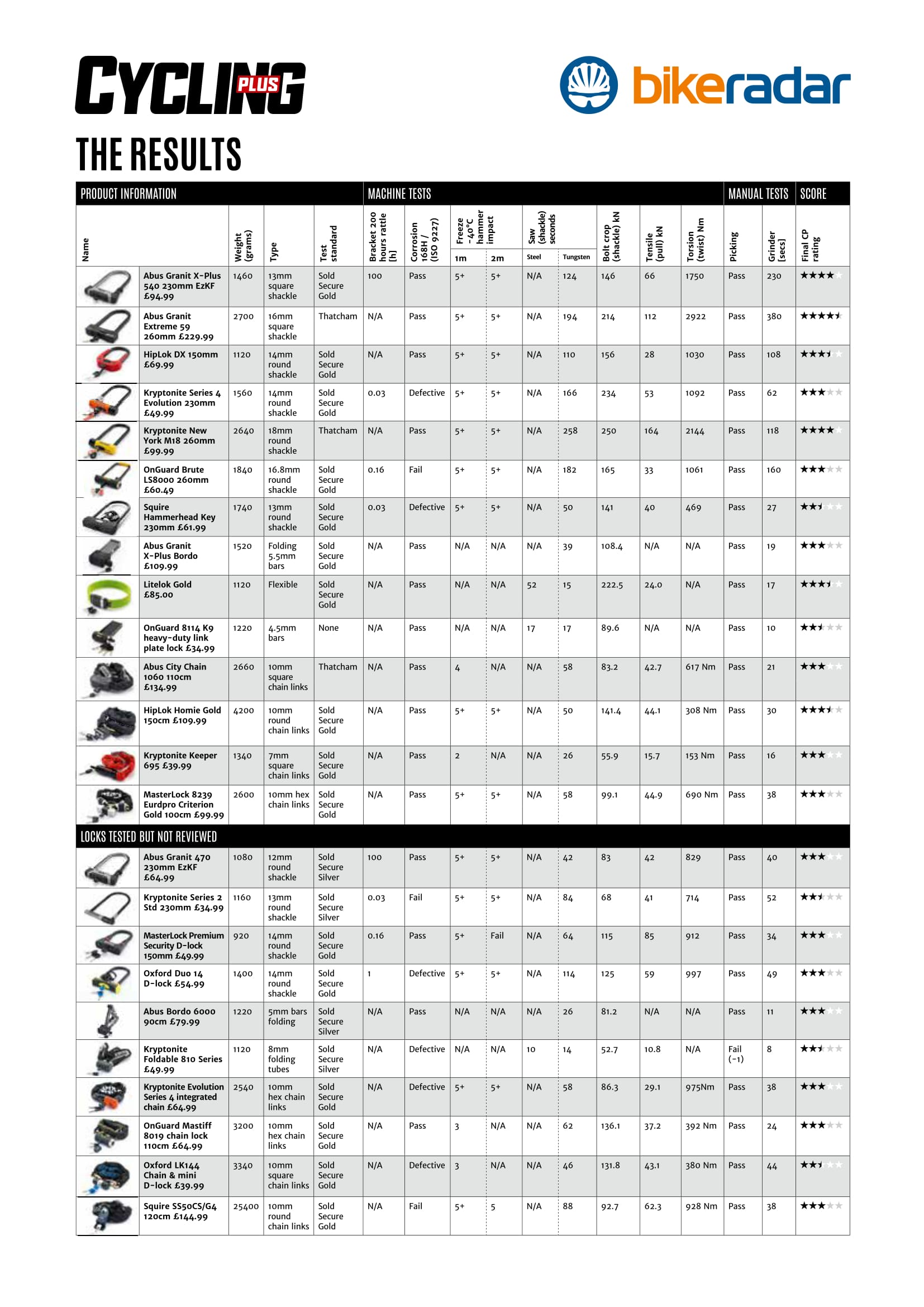 The resulting data from this massive test was collated and assigned a score for each test, but note that not all the tests are applicable to every lock design. The different designs were rated with an overall score, and you can read full reviews of the best seven below. For a full overview of how each of the 24 locks performed, here’s a chart showing the full results from this test.